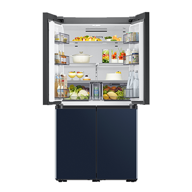 Samsung 4-Door Flex French Door BESPOKE Refrigerator | RF63A91C377/TL | 670 L: Name RF63A91C377/TL 4-Door Flex French Door BESPOKE Refrigerator 670L Shelf 1 EA Box 2 EA Icemaker Twist I/M LED Interior Light Yes Box 1 EA CoolSelect + Yes Convertible Room(℃) -23~-15, -5, -1, 2, 4 °C LED Interior Light Yes Shelf 2 EA Net for Freezer(Liter) 147 ℓ Net for Fridge(Liter) 379 ℓ Net Total(Liter) 526 ℓ Gross for Freezer(Liter) 274 ℓ Gross for Fridge(Liter) 396 ℓ Gross Total(Liter) 670 ℓ Cooling Type Triple Cooling Color GLAM WHITE+GLAM NAVY Display Type Internal Door Handle Recess Refrigerant R600a Door Alarm Yes Compressor Digital Inverter Compressor 20/40/40H (Container) 30(40ft) Net Width(mm) 912 mm Net Case Height with Hinge(mm) 1853 mm Net Case Height without Hinge(mm) 1797 mm Net Depth with Door Handle(mm) 673 mm Net Depth without Door Handle(mm) 673 mm Net Depth without Door(mm) 610 mm Packing Dimension (WxHxD)(mm) 972x1995x776 mm Net Weight(kg) 141 kg Packing Weight(kg) 151 kg Number of Door Pocket 6 EA Number of Shelf (Total) 4 EA Number of Vegetable&Fruit Drawer 3(Veg Box 2ea+Can store 1ea) EA Shelf Material Tempered Glass Egg Container(Egg Tray) Yes Shelf Type Spill Proof Interior Light Top & Side WiFi Embedded Yes * Actual components & product may differ from image shown or model you purchased or the country or region you live in.
